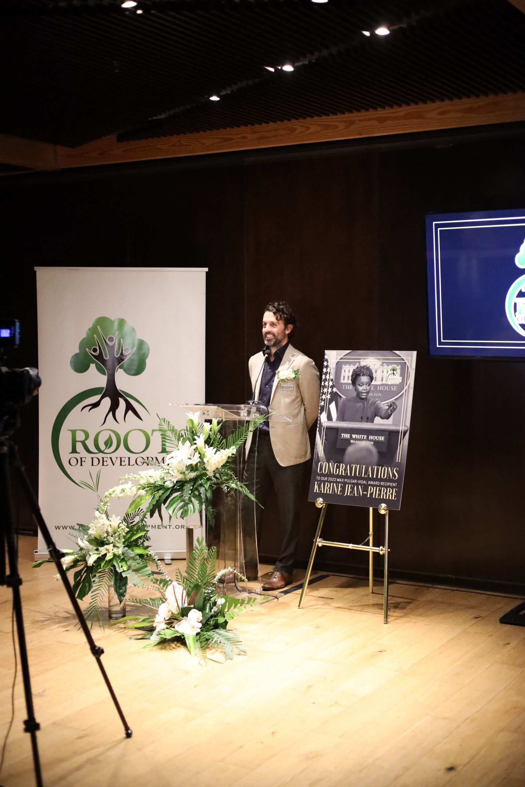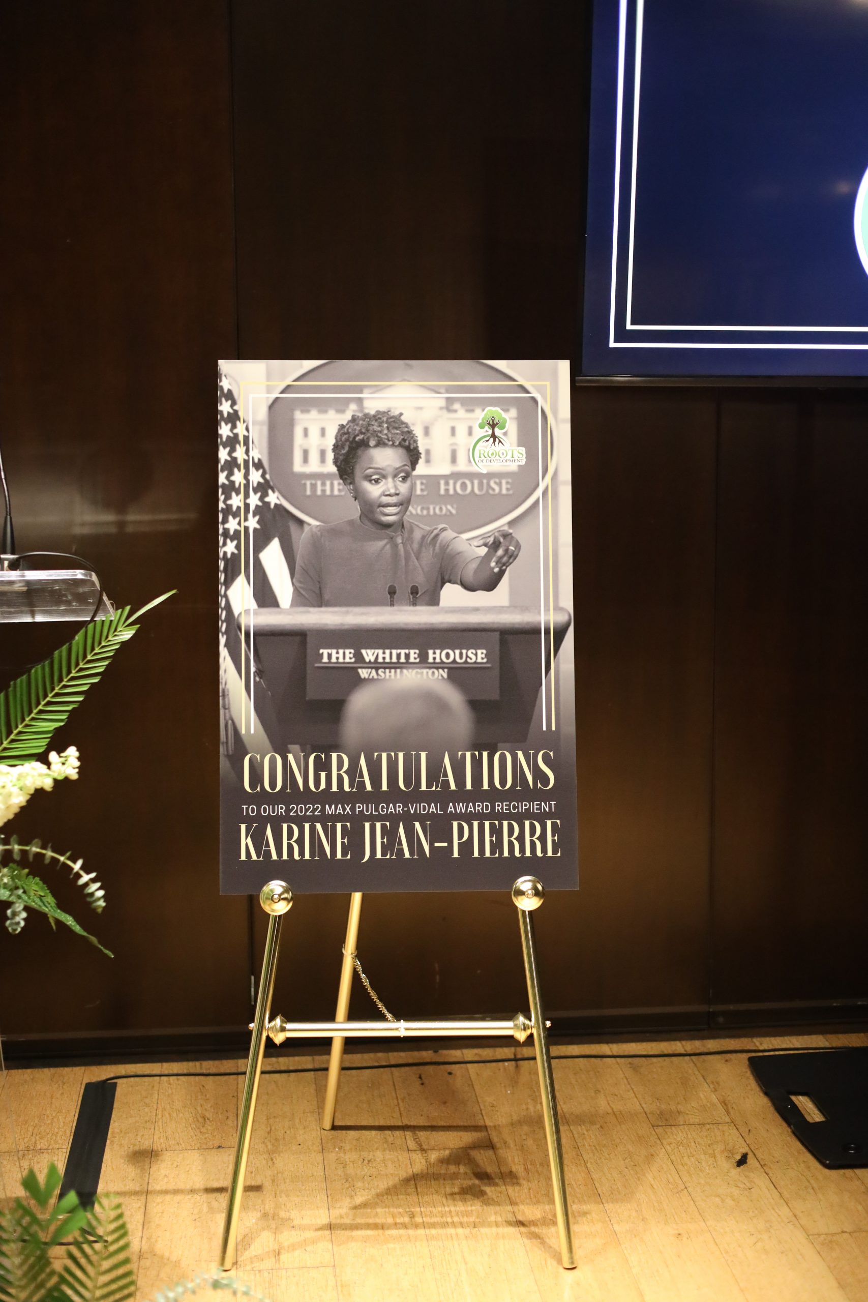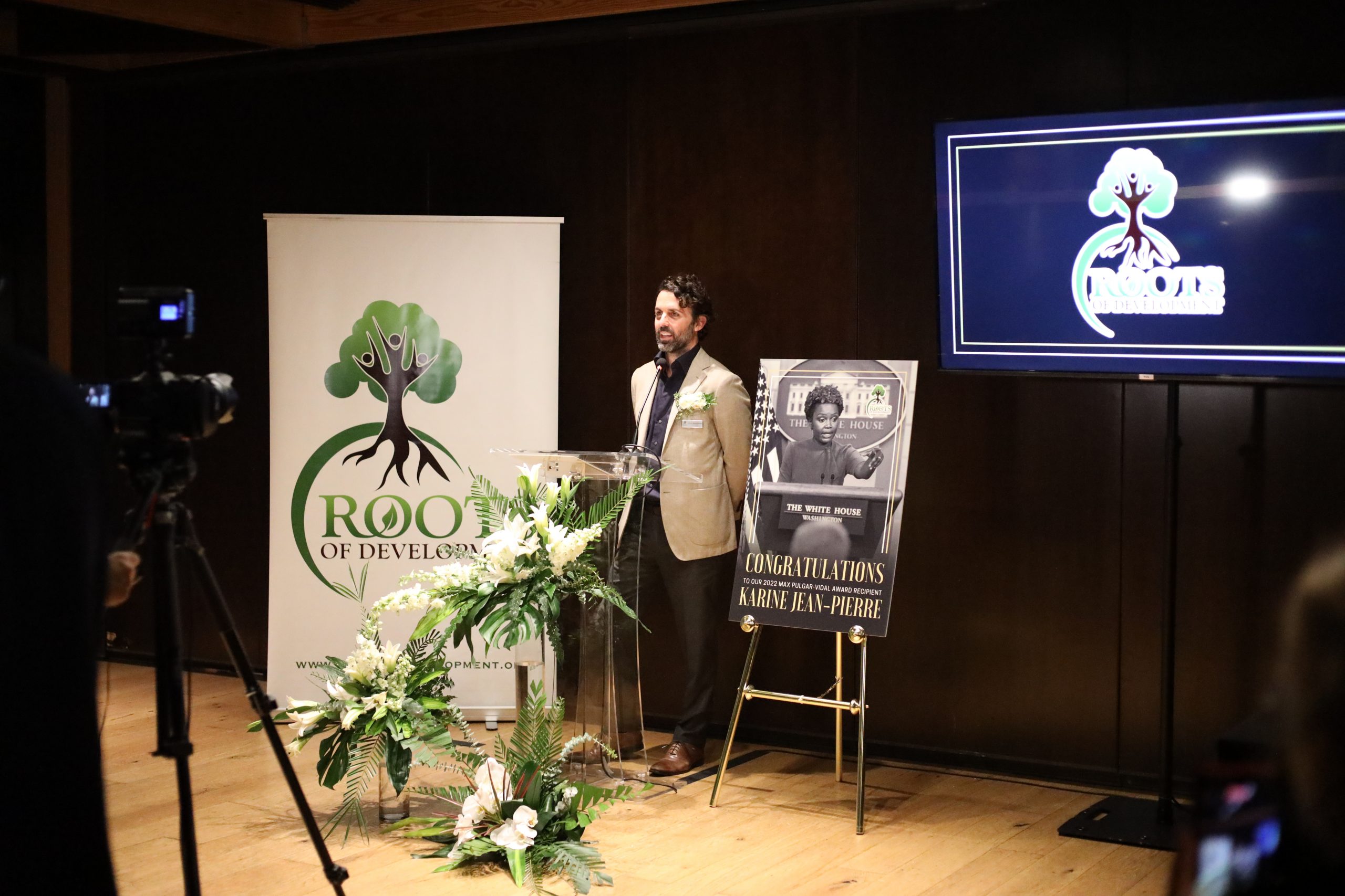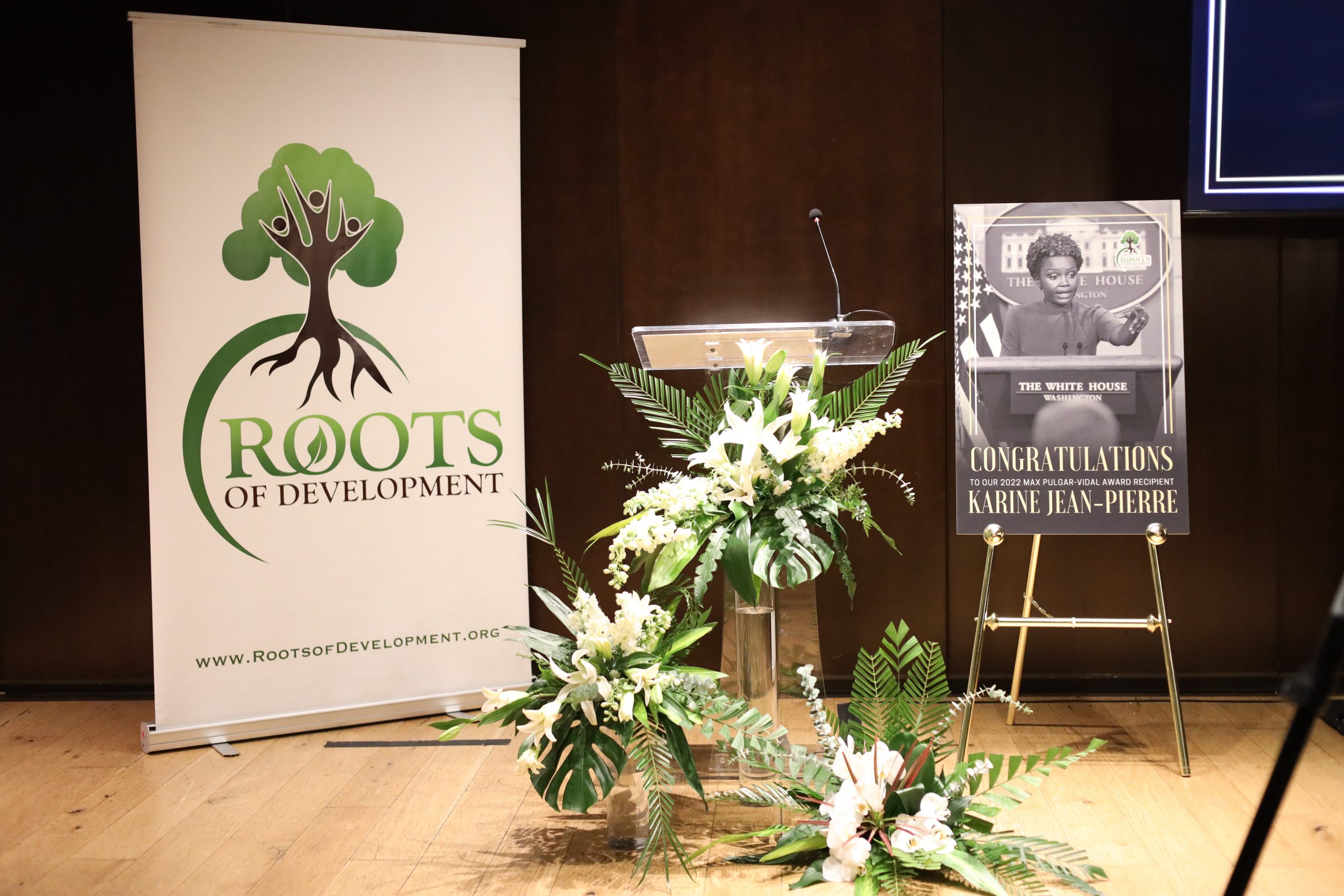 Karine Jean-Pierre accepts the 2022 Max Pulgar-Vidal Award from Roots of Development.